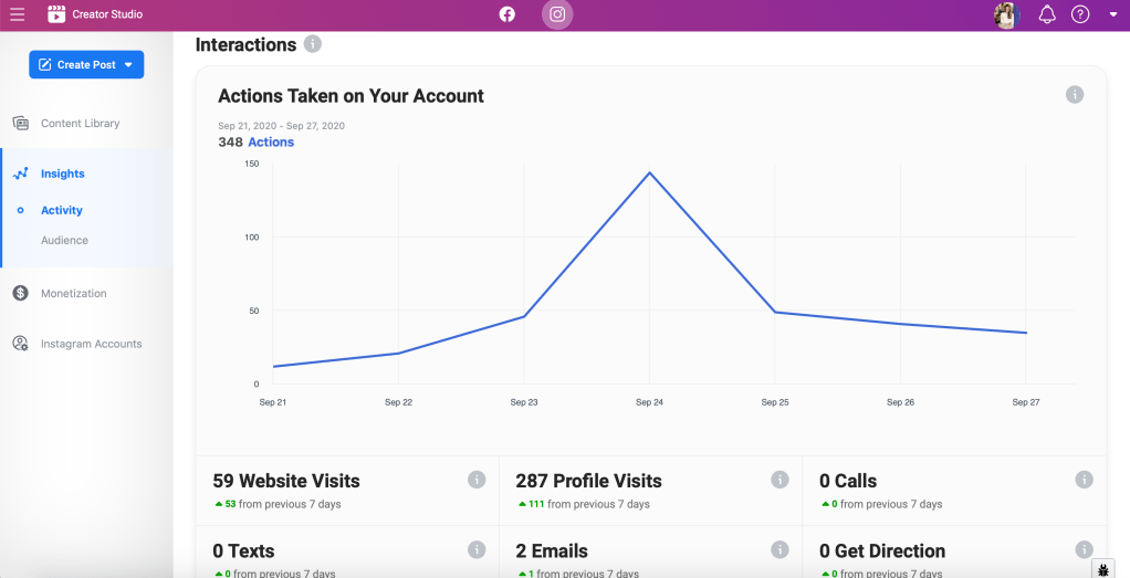 While I love Facebook Creator Studio (and I use it) to schedule content for Instagram I have to say their analytics are the WORST I’ve come across. Don’t waste your time. I think you’re much better off checking your insights on your mobile Instagram app.