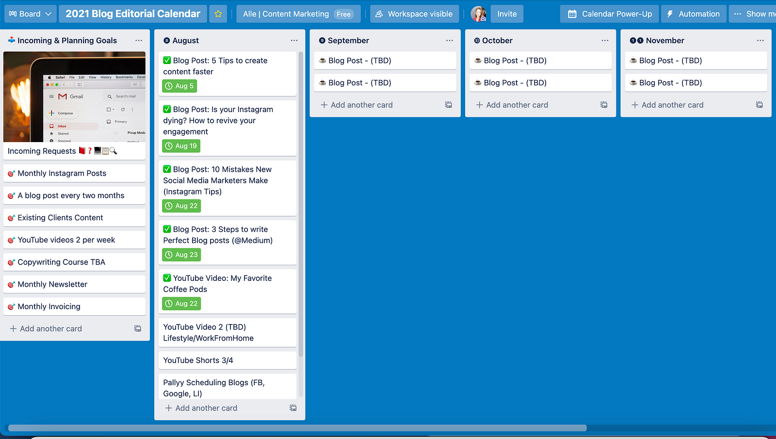 I like to use a digital planner like Trello to save and organize my blog post ideas. With Trello, I can track and visualize my monthly blog content in a single dashboard, categorize projects or add deadlines.