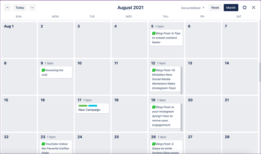 I like using Trello.com for saving post ideas, creating tasks, assigning dates, and tracking my daily to-do’s.
