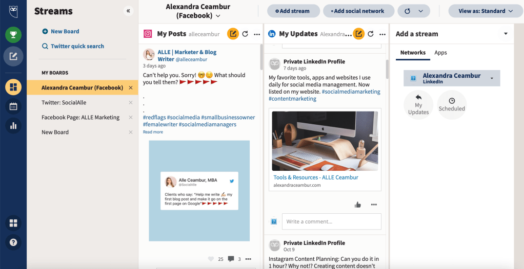 Hootsuite’s superpower is in its dashboard. With Hootsuite, you can create separate dashboards for each of your clients and add “streams” of all the different social media platforms you manage.