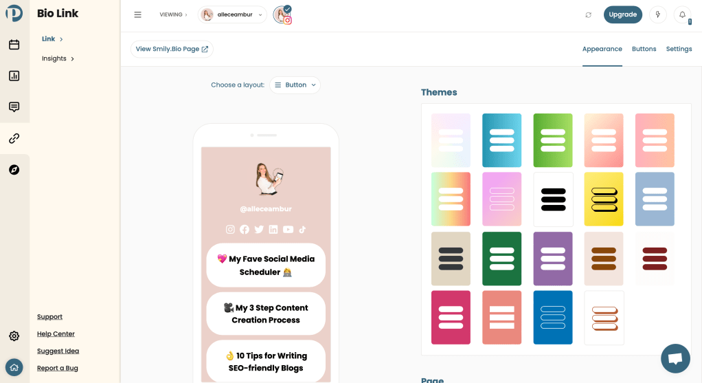 You can create a Bio Link by clicking the chain icon from the left menu bar. Then, you can add individual links (or clickable images), apply one of the existing colour themes, or personalize it with your brand colours (like me).