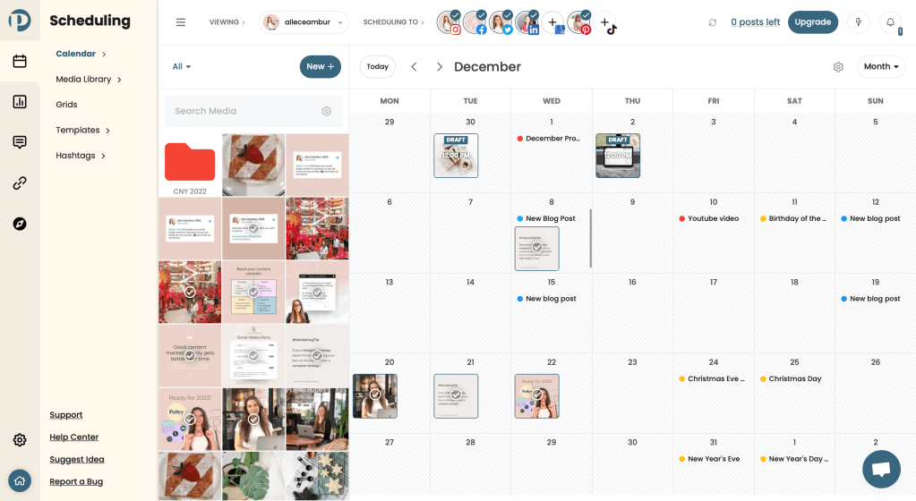 To schedule a post, select any image from the media library (on the left), drag it and drop it into a calendar day. That’s it! From there, you can customise the post, add a caption and schedule it or save it as a draft.