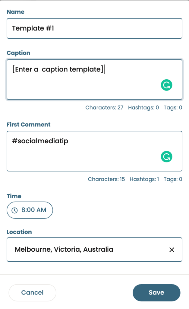 - Caption templates: Do you have a caption format you’d like to reuse (eg. Shout-out for new blog posts, Recurring Sale promo, etc.) then you can save caption templates for easy scheduling