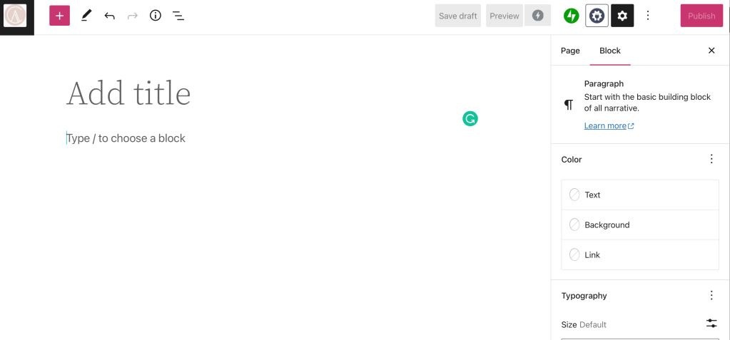 The “Write” button opens up the WordPress blog editor where you can type or paste your content. I prefer to type my blog articles in a Google Docs file and then do a few rounds of proofreading using Grammarly before importing my blogs into WordPress.