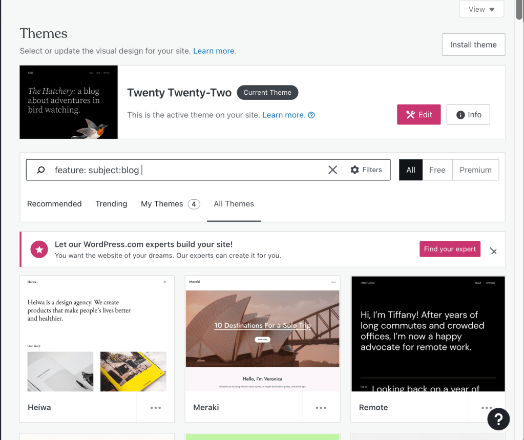 Tip: I like to search for themes using the filter for “Blogs” since that is the most important feature for me.