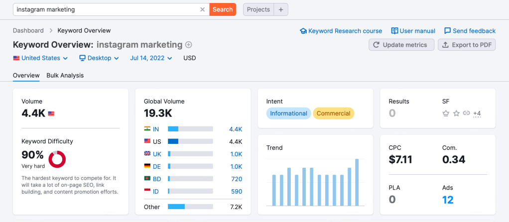 The keyword “Instagram marketing” is an example of a blog topic. SEMrush analysis shows that there are enough monthly searches (around 4.4k) and plenty of things you can write about.