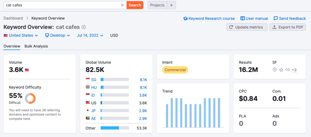 Instead, the keyword “Cat cafes” is a much better blog topic as the keywords have enough search volume (3.6k monthly searches) and are easier to rank (difficulty 55%)