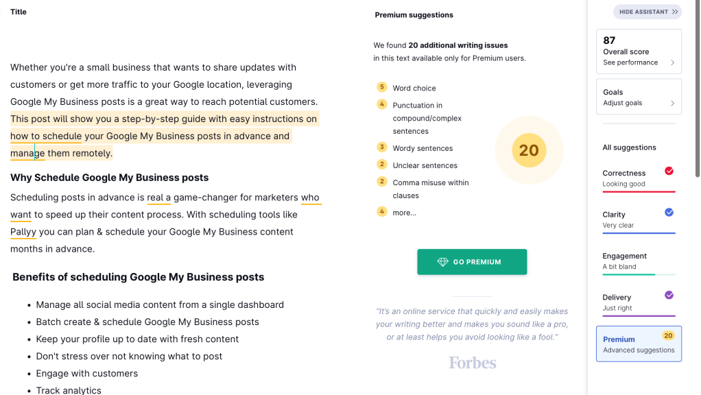 Your first few blog post draft will suck. So, don’t panic. Instead, take your time to review it and improve it. By making mistakes early on you can learn, and get better at writing over time. I like to use Grammarly to check and clear any grammar and punctuation mistakes and improve clarity. Hemmingway editor is also a free tool you can use to simplify your text and make your text easier to read.