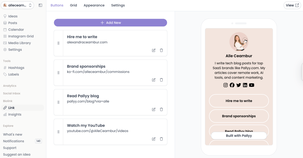 I’ve set mine up to link to my latest YouTube videos, blog posts, affiliate links, and a booking page for my writing services, and it honestly looks way better than some of the other free bio tools out there.