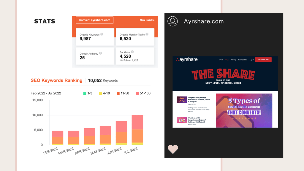 Ayrshare is an online platform for web developers where they can source social media APIs to build their own social media scheduling tool. Geoffrey and Boris, the founders of Ayrshare, reached out to Alle to collaborate on a couple of blog articles on social media marketing topics to help them grow their web traffic and improve Google ranking.